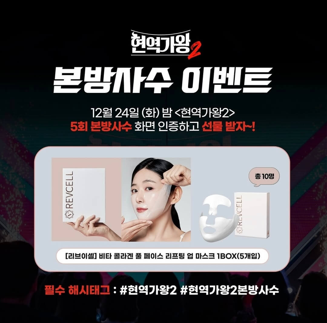 12월 24일 오늘밤에는 5회 방송이 나가는 날로 본방사수하고있는 화면을 사진으로 찍고 본인의 인스타에 필수 해시태그와 함께 올리면 총 10명을 뽑아 비타 콜라겐 풀 페이스 리프팅 업 마스크 1 BOX를 증정하는 이벤트도 한다고 하니까 참여해 보면 좋을 것 같습니다.