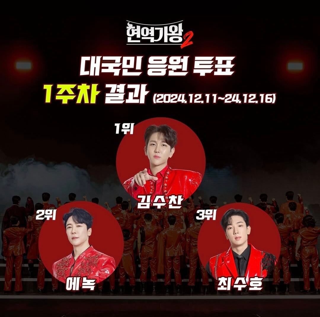 지난주 방송에서는 현역가왕2 투표하기 1주 차 결과가 공개되었습니다. 제가 예상했던 현역가수가 순위에 없어 당황하기도 했었으나 그마만큼 매일 진행되는 현역가왕2 투표하기가 결과를 좌지우지할 수도 있다는 걸 다시 한번 깨닫고 열심히 투표하기로 마음먹는 계기가 되기도 했습니다.