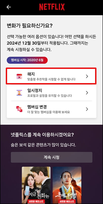 밑으로 조금 내리면 보이는 멤버십 해지 버튼을 누르고, 마찬가지로 일시정지 또는 요금제 변경없이 바로 해지를 원한다면 해지 완료 버튼을 누르고 진행하면 됩니다.