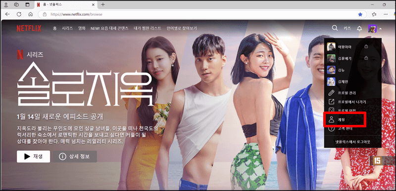 이번에는 웹사이트에서 넷플릭스를 해지하는 방법입니다. 넷플릭스 웹사이트에 접속하여 로그인한 뒤 오른쪽 상단에 있는 내 프로필 사진을 누르고 앱에서와 마찬가지로 계정을 클릭합니다.