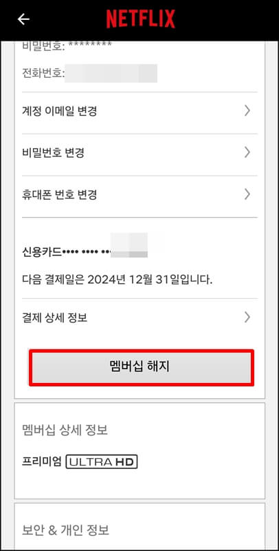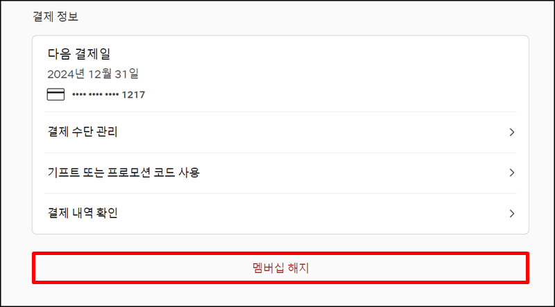 계정으로 들어가서 아래로 조금 내려가면 결제 상세 정보에있는 멤버십 해지 버튼을 클릭하고 일시정지 또는 멤버십 변경을 하지 않고 바로 구독취소를 하고 싶다면 해지 버튼을 한번 더 누르고 진행하면 됩니다.