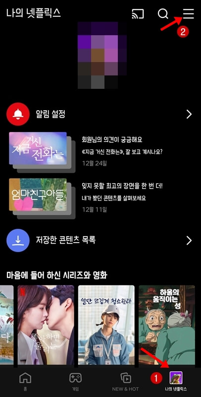넷플릭스 앱을 통해서 해지하는 방법을 먼저 알려드리도록 하겠습니다. 넷플릭스 앱이 접속하여 로그인 하뒤 오른쪽 하단에 있는 나의 넷플릭스 아이콘을 누르고 상단에 있는 삼선줄(메뉴)을 클릭하여 계정에 접속합니다.