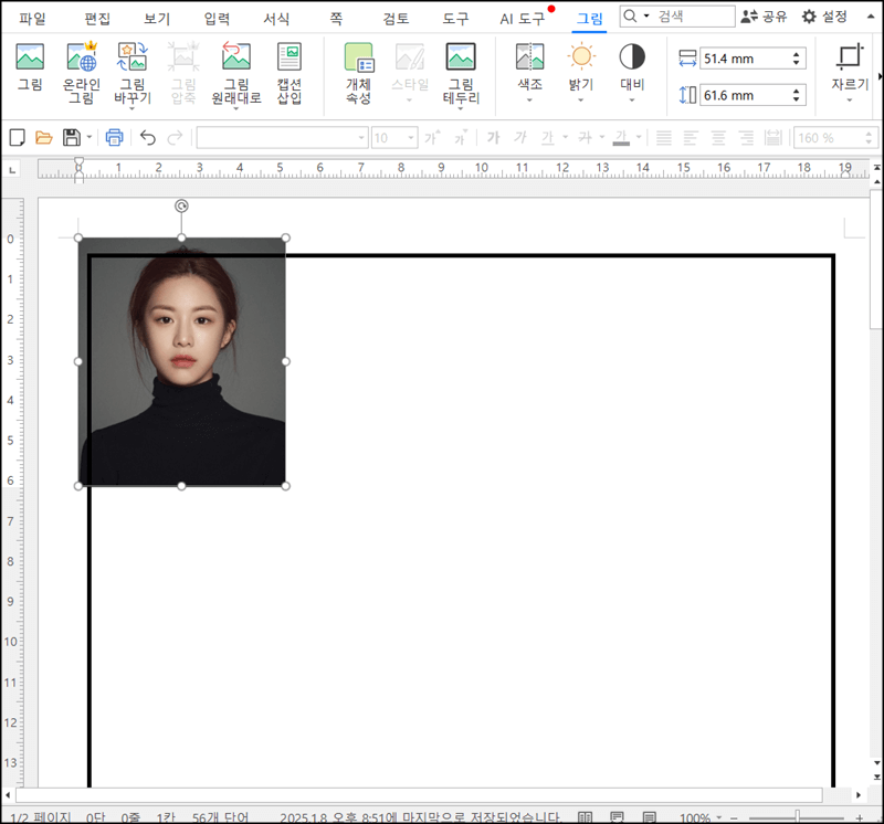 한쪽으로 치우쳐져 있던 사진이 가운데에 배열되어 있는 걸 확인할 수 있습니다. 만약 사진을 좀 더 사진칸에 꽉 채우고 싶다면 사진을 클릭한 뒤 마우스로 사이즈 조절을 해주면 됩니다.