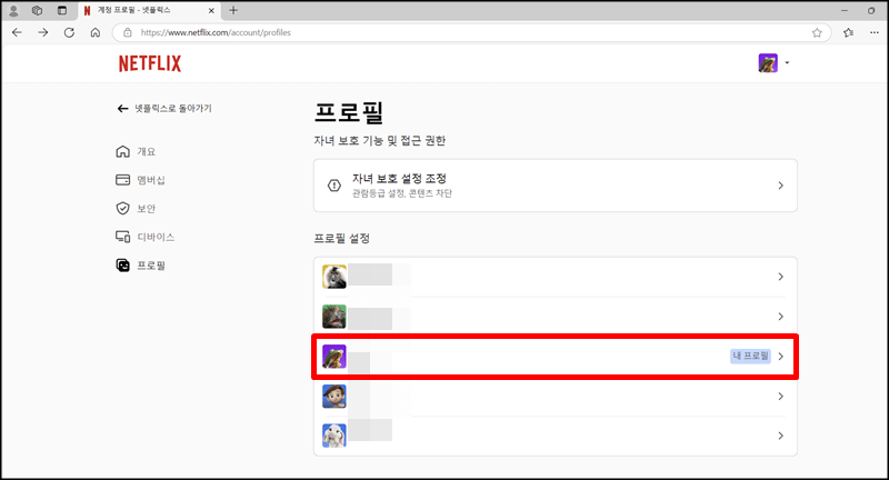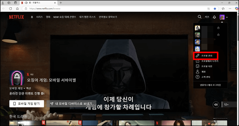 pc에서 넷플릭스 자막 크기 및 색깔 변경할 수 있는 경로는 똑같습니다. 단, PC버전에서는 글꼴도 바꿀 수가 있는데요~ 마찬가지로 넷플릭스에 접속하여 오른쪽 상단에있는 본인의 프로필을 클릭하고 프로필 관리로 들어갑니다.
