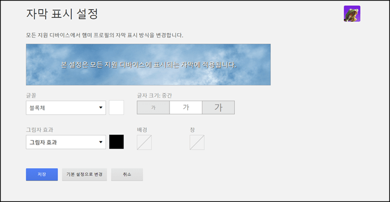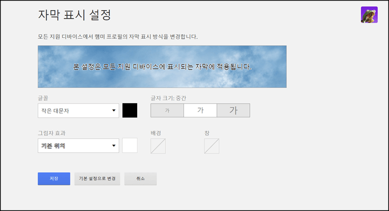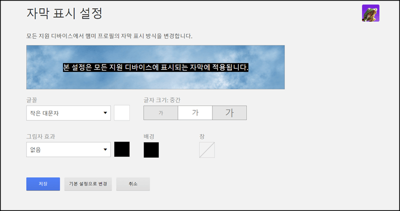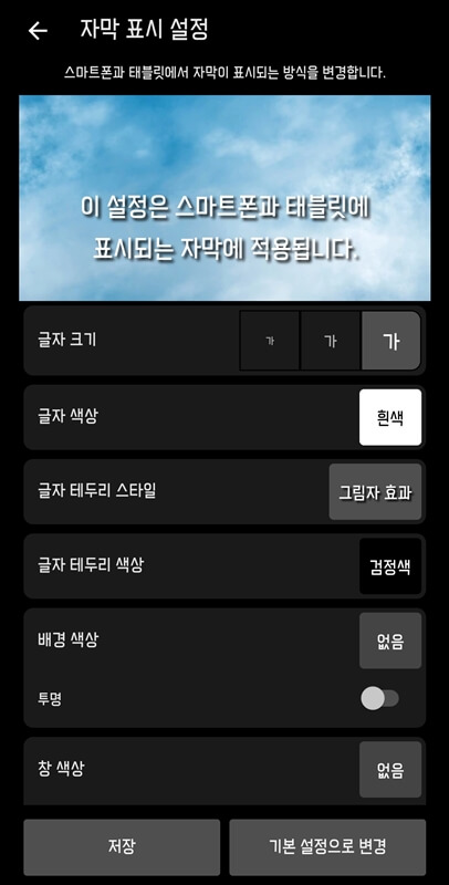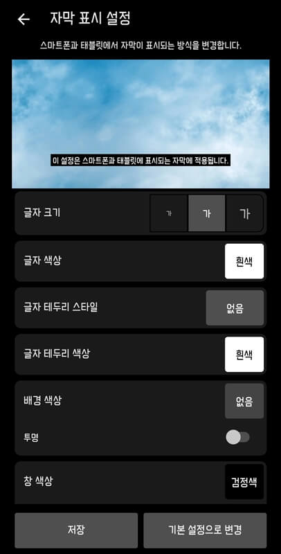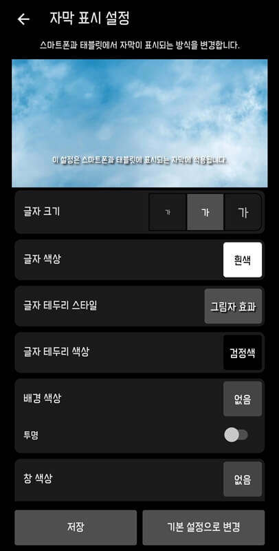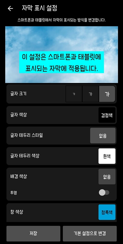 이런 식으로 자신의 취향에 맞게 자막 색깔이나 크기를 변경할 수 있으니까 설정 후 저장 버튼을 누르고 이용하면 됩니다.