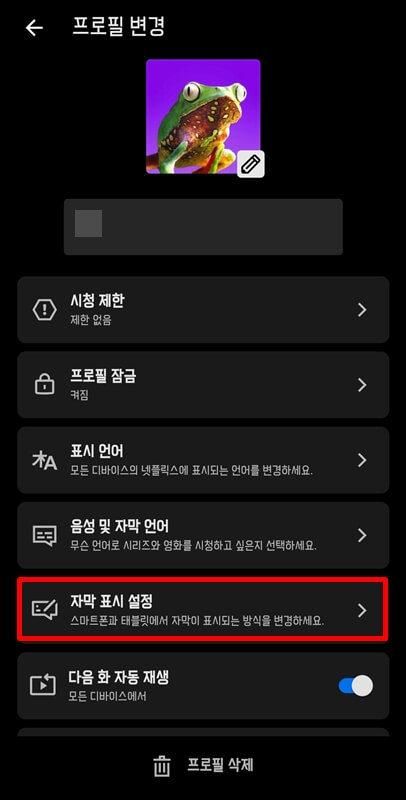 프로필 설정 목록에 있는 본인의 프로필을 선택한 후 자막 표시 설정을 클릭합니다.