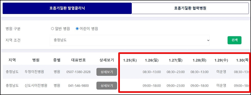 특히나 독감이 유행인 시즌이다보니 호흡기 질환을 앓고 있는 분들도 평소보다 많을 것이라고 생각되는데요~ E-gen 홈페이지에서는 호흡기질환 발열클리닉을 일반 병원과 어린이 병원으로 구분하여 조회할 수 있고, 병원의 운영시간 또한 확인할 수 있으니 참고하시기 바랍니다.