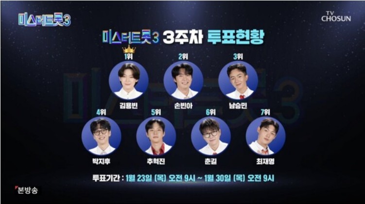 어제 본격적인 대결 무대가 펼쳐지기 전 여러분들이 참여했던 3주차 미스터 트롯3 투표 현황이 공개되었습니다. 3주차에 집계된 투표기간은 1월 23일(목) 오전 9시부터 1월 30일(목) 오전 9시까지 집계된 결과로 1위는 역시나 김용빈이 차지했고, 손빈아 또한 지난주에 이어 2위 자리를 지켜냈습니다. 3위는 남승민, 4위는 박지후, 5위는 추혁진, 6위는 춘길, 7위는 최재명이 이름을 올렸습니다.