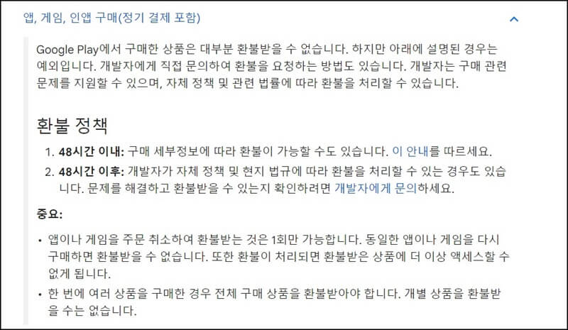 48시간 이내에는 자동으로 구글 플레이 환불 절차에서 환불이 이뤄지지만 48시간이 지났다면 개발자가 자체 정책 및 현지 법규에 따라 환불 처리할수있는 경우도 있기 때문에 개발자에게 문의하는 것이 좋습니다.