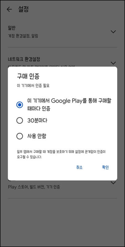 구매 시 인증 요구를 설정해 놓으면 아무래도 결제가 이뤄지기 전 기기에서 인증이 먼저 이뤄지기 때문에 혹시라도 한번 클릭으로 자동 결제되는 불상사를 막을 수 있습니다.