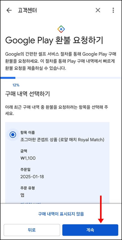 구글 플레이 환불 요청하기를 진행하다보면 내가 구매한 내역들이 쭈욱 뜨는데 그중 환불을 요청하려는 항목에 체크하고 계속 버튼을 누른 후 환불 사유 선택 > 환불 요청 검토를 거친 뒤 하단에 있는 환불 요청 버튼을 누르면 됩니다.