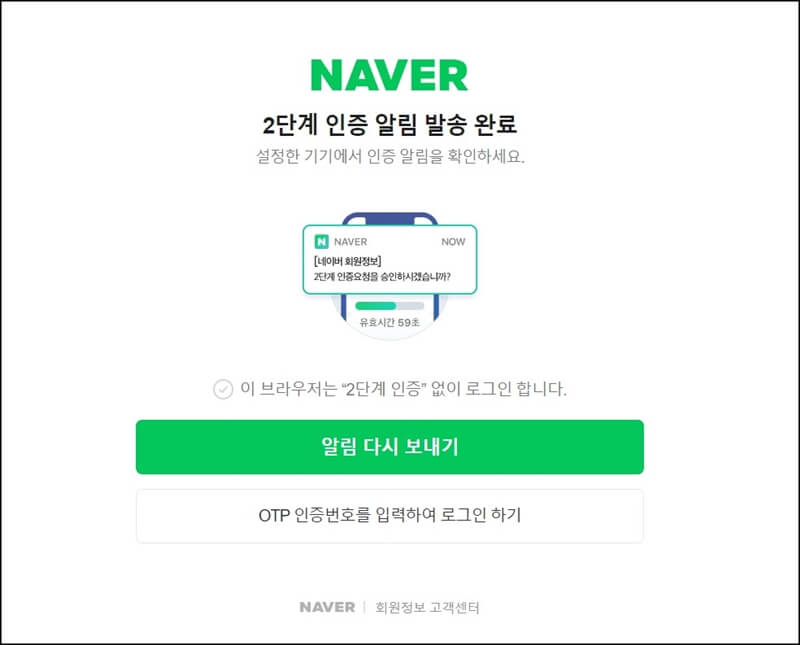 네이버 2단계 인증 설정을 완료했다면 로그아웃 후 다시 로그인할때 선택한 기기로 인증 알림이 발송되고, 모바일 앱에서 간편 로그인 또는 로그인 상태 유지 기능을 함께 사용하는 경우에는 최초 로그인 1회면 로그인을 위한 인증 단계가 진행되니 참고하시기 바랍니다.