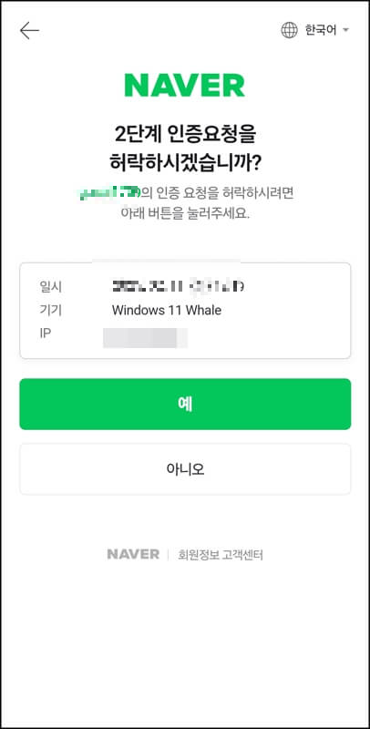 4. 핸드폰으로 2단계 인증요청 알림이 오면 예를 클릭하고, 이렇게 네이버 2단계 인증 설정이 완료되면 완료됐다는 화면이 뜹니다.