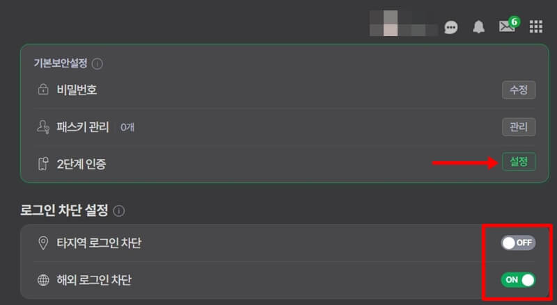 2. 2단계 인증 설정을 클릭한 뒤 다음 버튼을 클릭합니다. (로그인 차단설정에서 타지역과 해외 로그인 차단 버튼도 활성화해놓는 것이 좋습니다.)