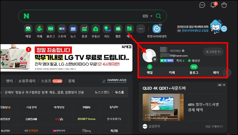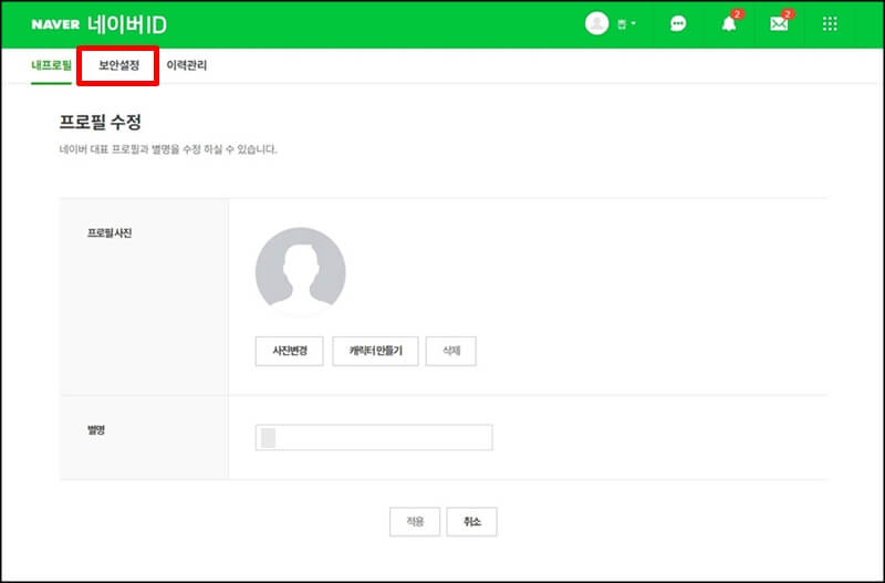 1. 네이버 2단계 인증 설정을 하려면 네이버에 로그인을 한 뒤 별명 옆에있는 네이버 ID 또는 프로필 사진을 클릭하고, 상단에 있는 보안설정을 클릭합니다.