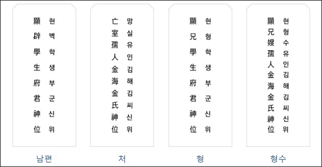 그리고 지방을 쓸 때에는 고인과 제사를 모시는 사람의 관계 그리고 고인의 직위 > 고인의 이름 > 신위 라고 위에서부터 순서대로 적어내려가면 되는데 남자 조상일 경우에는 이름을 써야 하는 위치에 부군(府君)이라고 적고, 반대로 여자 조상일 경우에는 본관과 성씨를 쓰면 되고, 자식 또는 동생일 경우에는 이름을 그대로 적으면 됩니다.