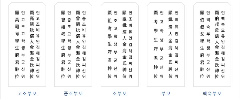 위의 차례상 지방쓰는법 예시를 보면 웃어른들의 지방에 현(顯)이라는 글자가 들어가 있는 걸 볼 수 있는데 현(顯)은 존경의 의미로 지방의 첫 글자로 붙이지만 제주의 아랫사람한테는 쓰지 않습니다. 그리고 고(考)는 돌아가신 아버지를 의미하고 비(妣)는 돌아가신 어머니를 의미하며 할아버지, 할머니의 경우에는 조고/조비, 그 위로 올라갈수록 증조, 고조식으로 칭호가 붙게 된다고 생각하면 됩니다.