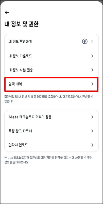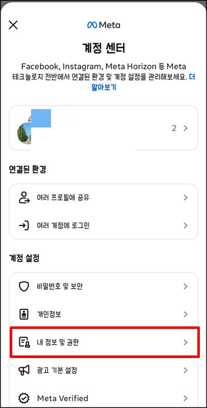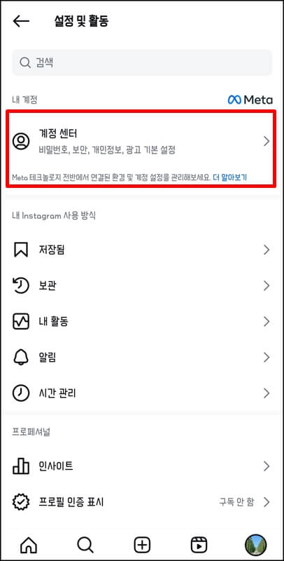 인스타 알고리즘 초기화를 위해서는 가장 먼저 검색내역을 지우는것입니다. 인스타 앱을 실행한 뒤 오른쪽 하단에 있는 내 프로필 > 오른쪽 상단에 있는 메뉴로 들어가서 계정센터 > 내 정보 및 권한 > 검색내역 순으로 접속합니다.