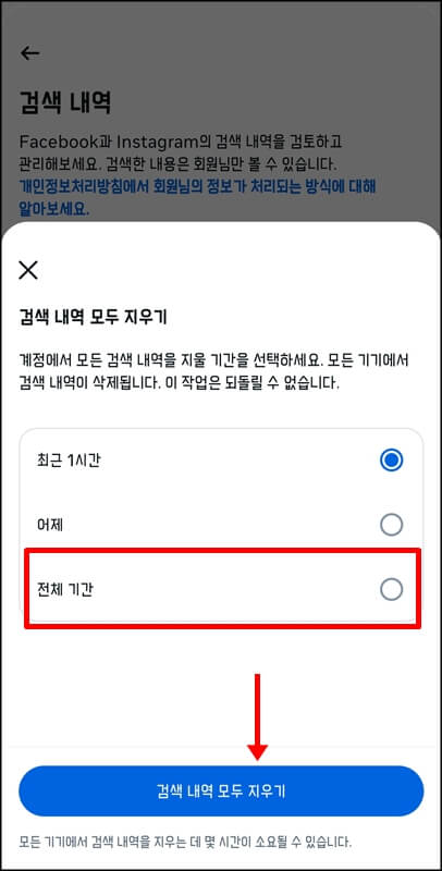 이후 하단에있는 검색 내여 모두 지우기를 클릭하고, 계정에서 모든 검색 내역을 지울 기간을 선택한 뒤 한번 더 검색 내역 모두 지우기 버튼을 클릭합니다. 이렇게 검색내역을 지우면 모든 기기에서의 검색 내역이 삭제됩니다.