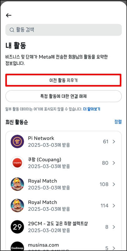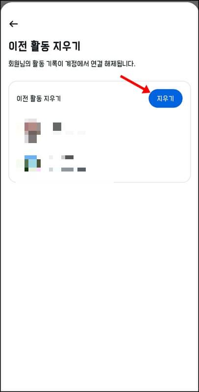 이후 이전 활동 지우기기를 클릭하고, 한번 더 지우기 버튼을 눌러 외부활동 기록을 지워줍니다.