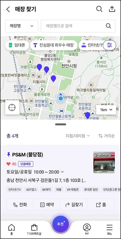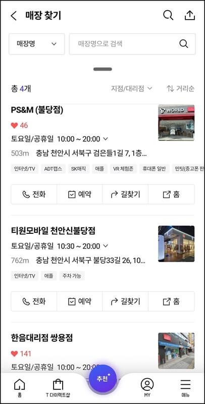 그럼 내 위치와 가까운 sk텔레콤 유심 무상교체 가능한 대리점들이 가까운 위치순으로 노출이 되는데요~ 영업시간뿐만 아니라 주소, 전화, 예약, 네비게이션을 조회할 수 있으니까 방문하기 전 미리 유심 재고 여부를 파악하고 방문하면 될 것 같습니다.