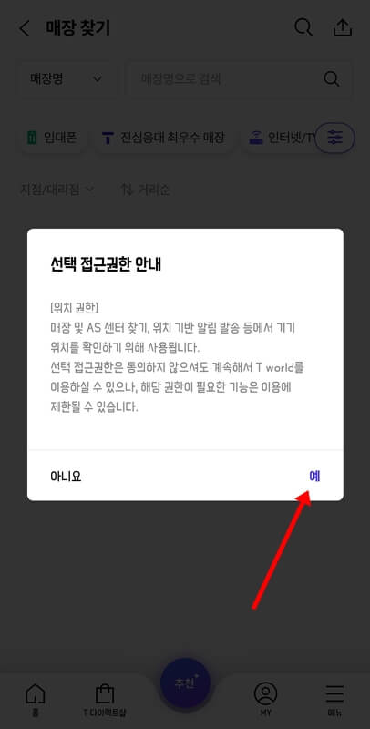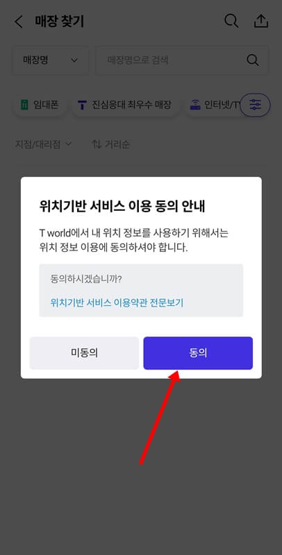 배너를 누르고 매장찾기로 이동했다면 위치기반 서비스 이용동의 안내에 동의하고, 선택접근권한 안내에서도 예를 누른 후 t월드에서 내 핸드폰의 위치 정보에 액세스 하도록 앱 사용 중에만 허용을 클릭합니다.