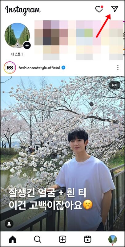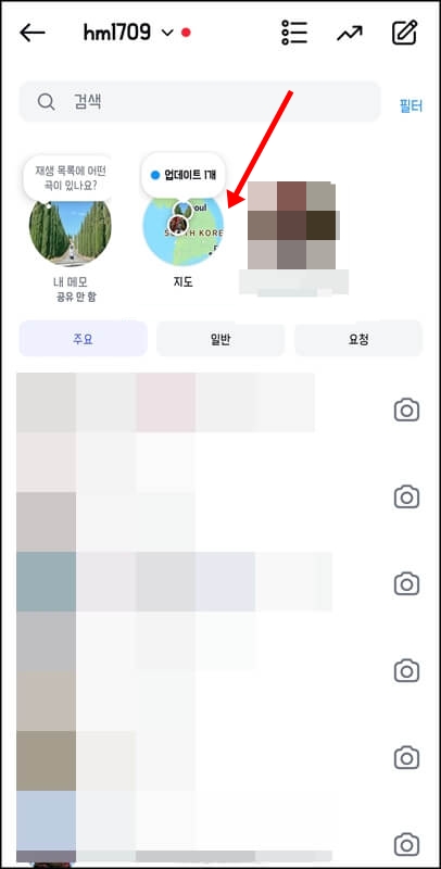 인스타 위치공유 끄기 방법은 생각보다 간단했습니다. 인스타 게시물을 보는 화면에서 상단에 있는 DM(메시지) 아이콘을 클릭한 후 지도를 클릭해 줍니다.