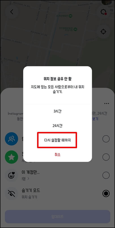 그런 다음 오른쪽 상단에 있는 설정(톱니바퀴)을 누르고 위치정보공유 팝업에서 숨기기 모드를 체크한 뒤 다시 설정할 때까지를 선택해 주면 됩니다.