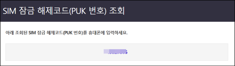 본인인증을 하고 나면 위의 이미지처럼 8자리의 puk 코드 번호를 확인할 수 있습니다.