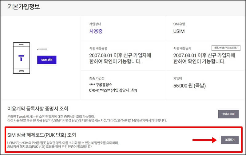 이후 기본가입정보에서 sim 잠금해제코드인 puk 번호 조회하기 버튼을 통해 조회를 할 수 있습니다.
