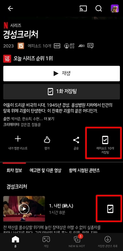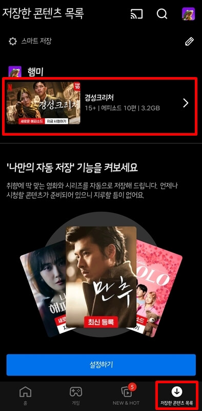 이렇게 넷플릭스 다운로드된 영화와 드라마는 하단에있는 저장한 콘텐츠 목록에 들어가면 내가 다운로드한 콘텐츠를 확인할 수 있습니다.