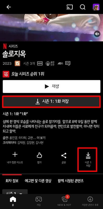 넷플릭스에서 영화나 드라마를 다운로드 하려면 넷플릭스 앱을 실행 후 본인의 프로필을 선택해 접속해 줍니다. 이후 다운로드하고자 하는 영화나 드라마를 검색하거나 찾아서 재생버튼 아래 있는 저장 버튼을 클릭해 주면 되는데요~ 만약 회차별로 다운을 하려면 회차별 영상 목록에 있는 저장버튼을 클릭하면 되고 모든 회차를 한 번에 저장하기 위해서는 재생버튼 아래에 있는 저장 버튼 또는 공유버튼 옆에 있는 저장버튼을 눌러서 실행하면 됩니다.