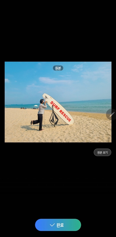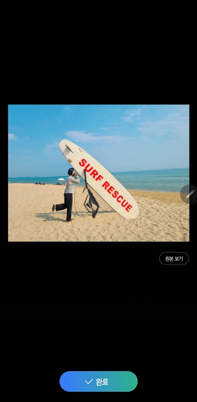 저는 서핑보드를 선택하여 크기를 한번 키워줘봤는데요~ 왼쪽은 원본사진이고 오른쪽은 갤럭시 s24 울트라 카메라 ai기능을 사용하여 서핑보드를 키워준 후의 사진인데 서핑보드를 받쳐주는 부분은 말끔하게 편집이 되진 않았으나 사진에 따라서 꽤 만족할만한 결과물을 얻을 수 있습니다.