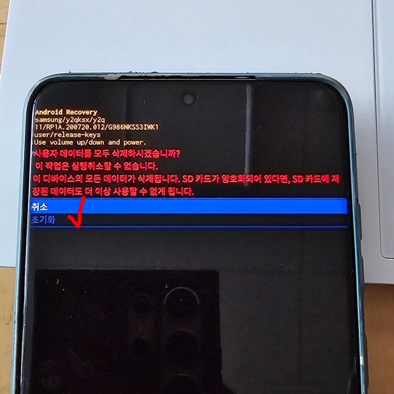3. 사용자 데이터를 모두 삭제하겠냐는 물음에 취소 또는 초기화 버튼을 누를 수 있는데 위와 마찬가지로 볼륨버튼으로 초기화로 이동한 후 전원(확인) 버튼을 눌러줍니다.