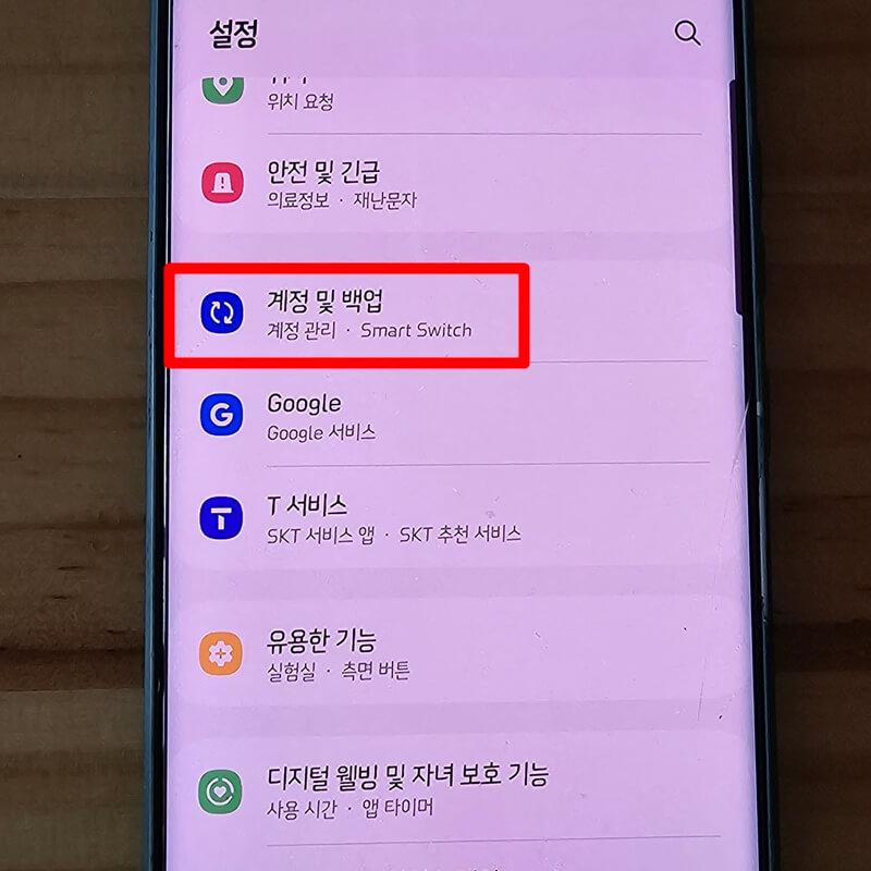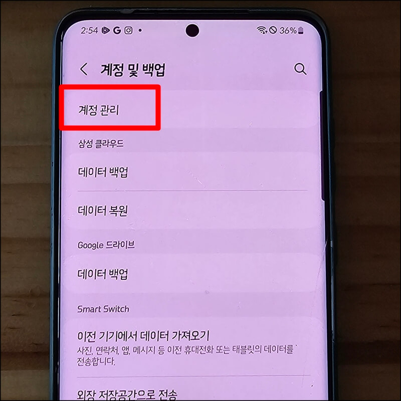 1. 삼성 갤럭시 공장초기화 방법으로 들어가기전 중요한 데이터나 사진, 동영상, 연락처등을 컴퓨터 또는 삼성 클라우드에 백업해 놓고, 새로 바꾸는 기기에 스마트 스위치앱을 이용하여 데이터를 이동까지 해준 다음 핸드폰 설정 > 계정 및 백업 > 계정관리로 들어가서 초기화하고자 하는 스마트폰에 로그인 되어있는 계정 목록을 하나씩 눌러 계정삭제 또는 로그아웃을 진행해 줍니다.
