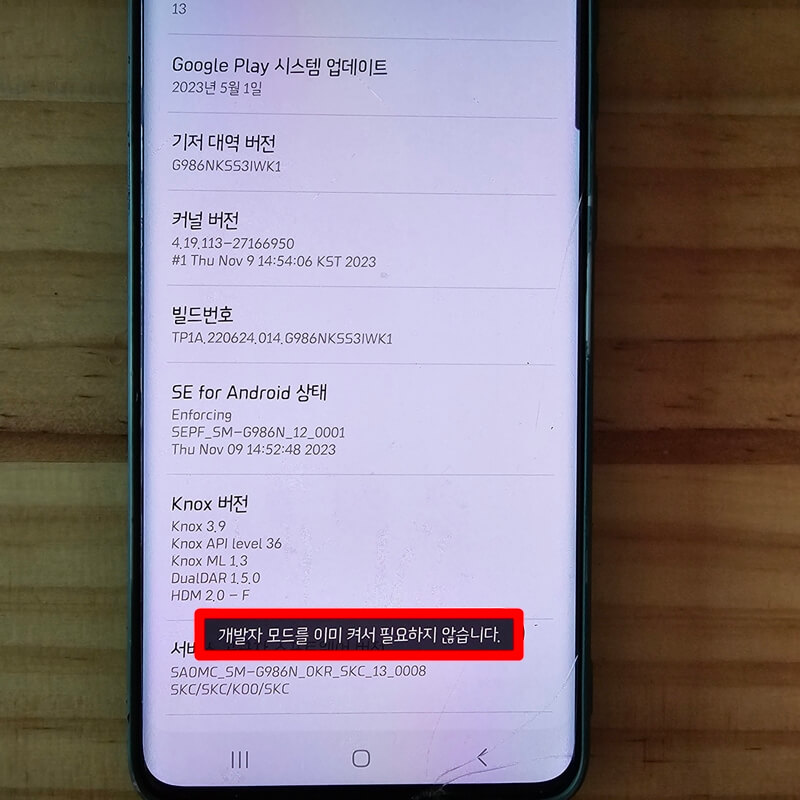 빌드번호 항목을 '개발자 모드라 활성화되었습니다'라는 메시지가 나올 때까지 연속해서 여러 번 터치해 줍니다. 저는 이미 개발자 모드를 활성화시켰더니 개발자 모드를 이미 켜서 필요하지 않다는 문구가 떴어요.