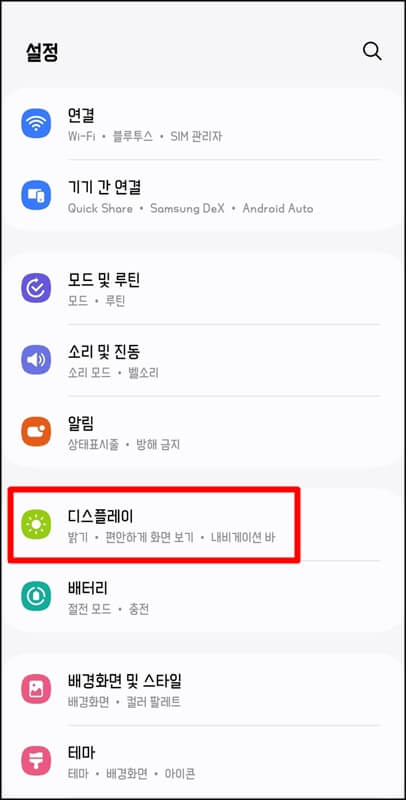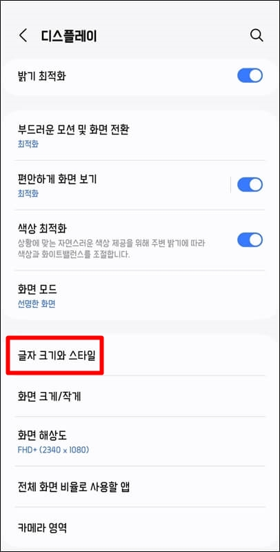 그럼 이제 갤럭시 폰트 변경 및 글꼴 바꾸기 방법을 알려드리겠습니다. 핸드폰 설정 > 디스플레이 > 글자 크기와 스타일 > 글꼴 순으로 들어갑니다.