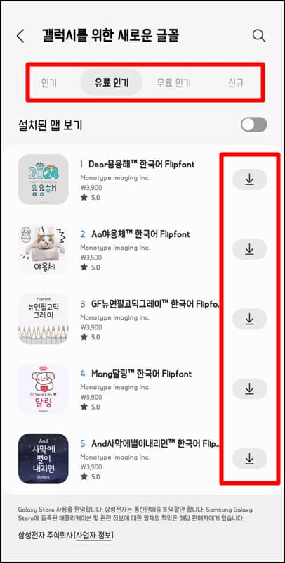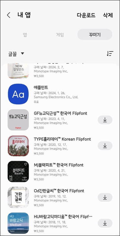 갤럭시 스토어에 들어가서 메뉴 > 내 앱 > 꾸미기 > 글꼴 순으로 들어가면 내가 지금까지 갤럭시 핸드폰을 사용하며 구매했던 폰트들을 볼 수 있습니다. 그러니까 새로운 핸드폰으로 바꾸면 이곳에서 폰트를 다시 다운로드해야 하는데 유료폰트라고 하더라도 이전 기기에서 내가 돈을 내고 구매한 폰트였다면 무료로 다운로드 가능하니 참고하세요.