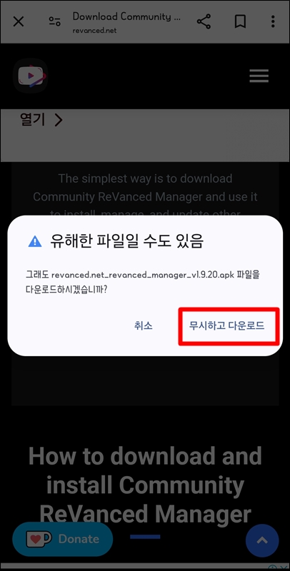 2. 리밴스드 매니저 파일을 클릭하면 유해한 파일일 수도 있다는 경고창이 뜨는데요~ 이는 구글에서 공식적으로 운영하고 있는 플레이스토어에서 제공되는 앱이 아닌 외부 apk 파일이기 때문에 형식적으로 뜨는 경고창이니 무시하고 다운로드를 누르고 진행하면 됩니다.