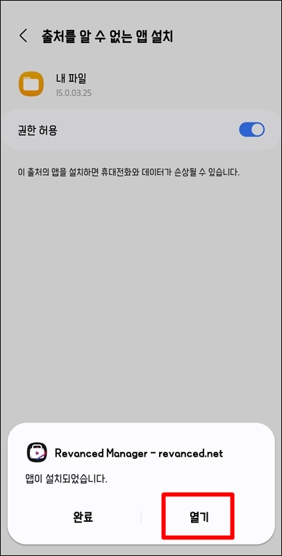 핸드폰 배경화면에 설치된 리밴스드 매니저 apk 파일을 실행하면 출처를 알 수 없는 앱 설치 경고창이 한 번 더 뜨는데 이는 앞에서 설명드렸으니 무시하고 설치를 누르고 진행하면 됩니다.