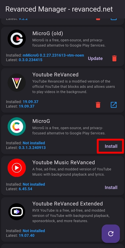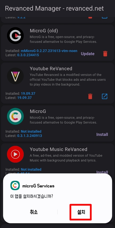 4. 이제 MicroG를 설치해줘야 하는데요~ MicroG는 현재 0.3.1.3.240913이 최신버전이고 마찬가지로 Install 버튼을 눌러 설치해줍니다. 저는 이 단계에서 악성앱으로 의심된다는 경고창이 떴는데 이 또한 앞서 얘기했기 때문에 무시하고 설치 버튼을 누르고 진행하면 됩니다.