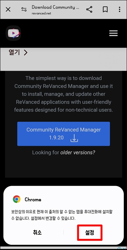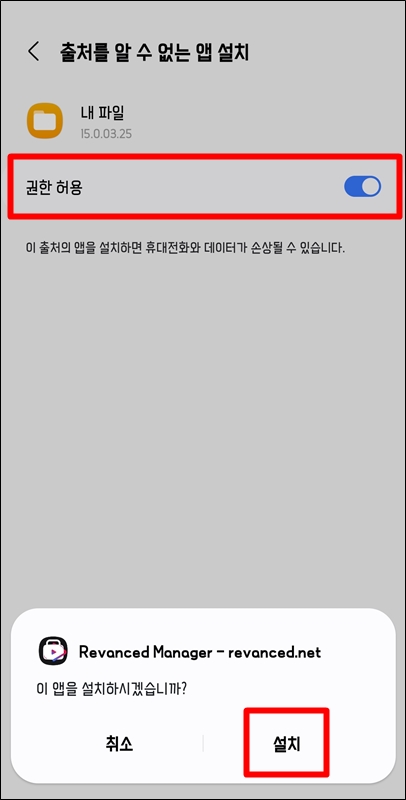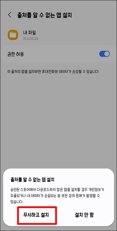 저 같은 경우는 핸드폰을 새로 교체한 바람에 출처의 알 수 없는 앱을 휴대전화에 설치할 수 있는 설정을 변경해야 하는 팝업이 떠서 설정을 누르고 권한을 허용한 뒤 설치를 진행했습니다.