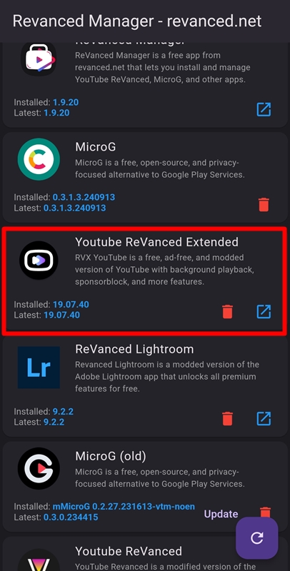 3. 설치가 완료되면 열기버튼을 누르거나 핸드폰 바탕화면에 설치된 Revanced Manager 앱을 실행하여 Youtube Revanced Extended를 찾아서 Install을 눌러 설치해 줍니다. (저는 이미 설치되었기 때문에 install 버튼이 없으니 참고) 여기서 유튜브 리밴스드 최신버전은 19.07.40이라는 걸 확인할 수 있습니다.