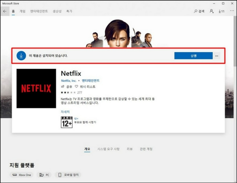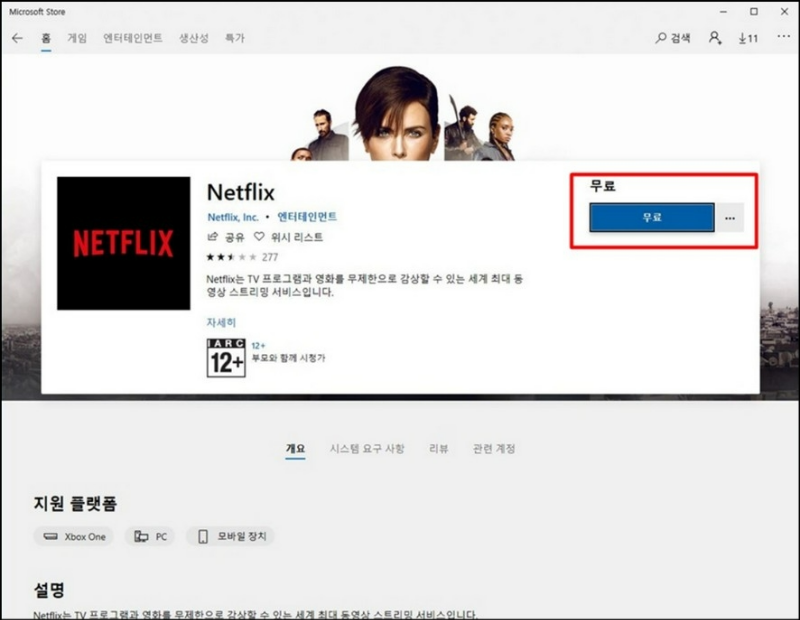 마이크로소프트 스토어를 실행하고 검색창에 넷플릭스를 검색한 뒤 무료라고 뜨는 넷플릭스를 클릭하고 파란색의 무료 버튼을 눌러 설치를 진행합니다.