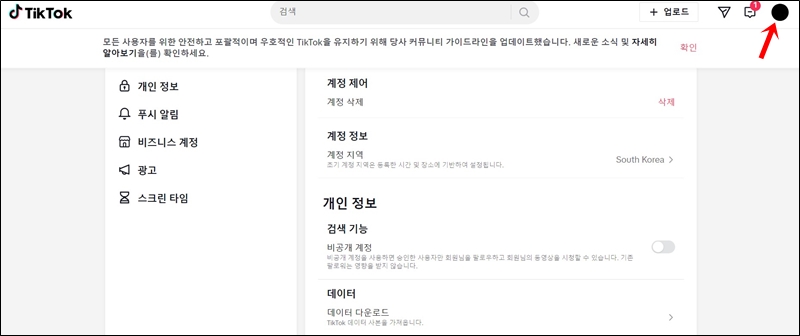 틱톡 공식 홈페이지로 들어가서 로그인 한 뒤 오른쪽 상단에있는 프로필 사진을 클릭하고 설정으로 들어가면 맨 위에 계정제어 = 계정삭제 버튼이 있습니다. 카톡으로 가입했을 때는 카카오톡에서 먼저 카톡과의 연동을 끊어야 한다고 하는데 번거로우니까 그냥 틱톡 앱 또는 틱톡 홈페이지에서 탈퇴를 진행하면 됩니다.