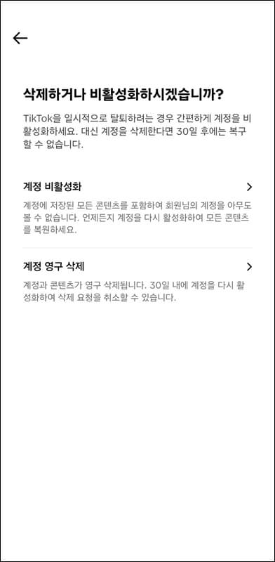 계정으로 들어가서 비활성화 또는 계정삭제 버튼을 누르고 영구삭제와 비활성화중 하나를 선택하고 진행하면 되는데 틱톡 라이트 탈퇴 전 계정을 잠시 비활성화해두면 언제든 다시 활성화할 수 있지만 틱톡 라이트 계정 삭제를 진행하면 계정과 콘텐츠가 영구적으로 삭제됩니다.