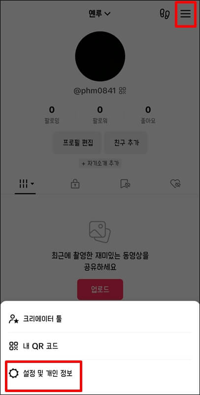 틱톡 라이트를 가입할때 카카오톡 아이디가 아닌 구글 이메일 등으로 가입을 하셨던 분들은 틱톡 라이트 앱에서도 쉽게 탈퇴를 할 수가 있는데요~ 틱톡 라이트를 실행하고 본인의 프로필로 들어가서 상단에 있는 삼선줄을 클릭한 뒤 설정 및 개인정보로 들어가서 계정을 선택합니다.