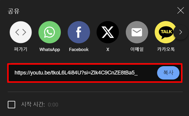 공유버튼을 누르면 공유하고자 하는 앱들이 쭉 나열되고 바로 밑에 해당 영상의 주소가 떠있는데요~ 여기서 영상의 주소를 복사 한 뒤