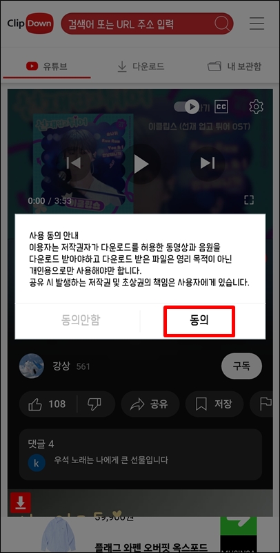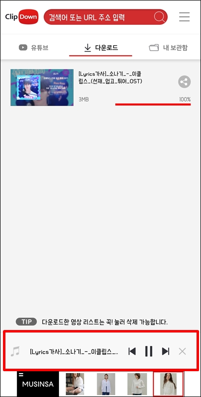 사용동의 안내창에서 동의를 누르면 다운로드가 진행되고 해당 파일을 클릭하면 음원이 재생됩니다. 클립다운에 다운로드해놓은 음원들을 재생시킨 후 다른 앱을 실행하더라도 정상적으로 재생되는 걸 확인할 수 있습니다.