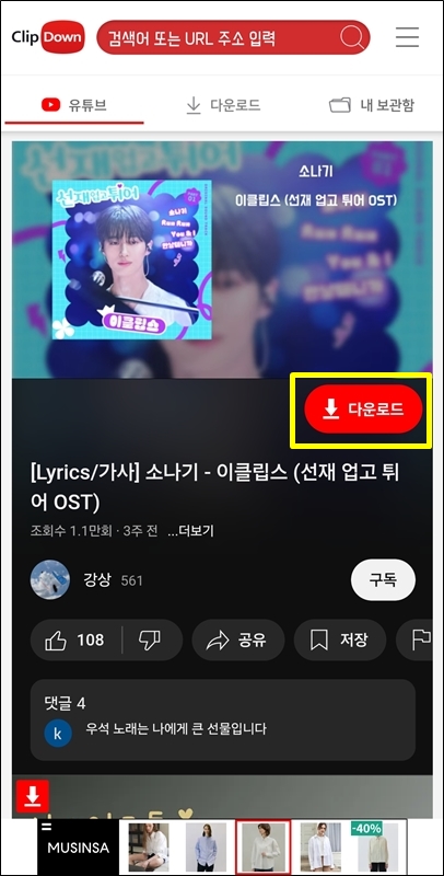 첫번째로 소개해드릴 유튜브 음원추출 사이트는 클립다운이라는 앱입니다. 유튜브 음원추출 클립다운은 스마트폰용이라고 볼 수 있는데요~ 클립다운은 단 한 번의 설치로 유튜브 영상에서 별도의 복사 붙여 넣기 없이 한 번에 음원추출이 가능하고, 무엇보다 다른 앱을 사용하더라도 재생이 되는 백그라운드 기능도 탑재되어 있는 것뿐만 아니라 추출한 음원들이 내 보관함에 저장되어 유튜브 음원추출 mp3로 사용하는데 가장 최적화되어있는 앱이라고 볼 수 있습니다.